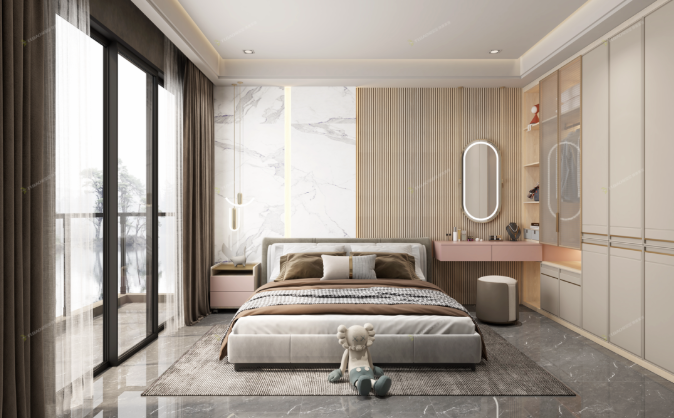 平开门需要注意与床头柜保持距离,防止打不开。如果空间着实紧凑可以分段设计,柜门高度比床头柜略高,则无打开烦恼。或者从床头柜下手,简化或用边几代替。