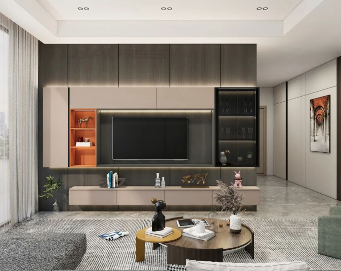 电视柜周围做了灯光设计,与背景墙更有层次感。UV肤感和橙色皮纹同样在电视柜中进行应用,整体统一。