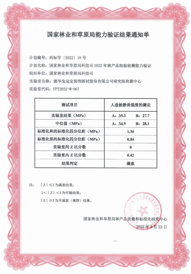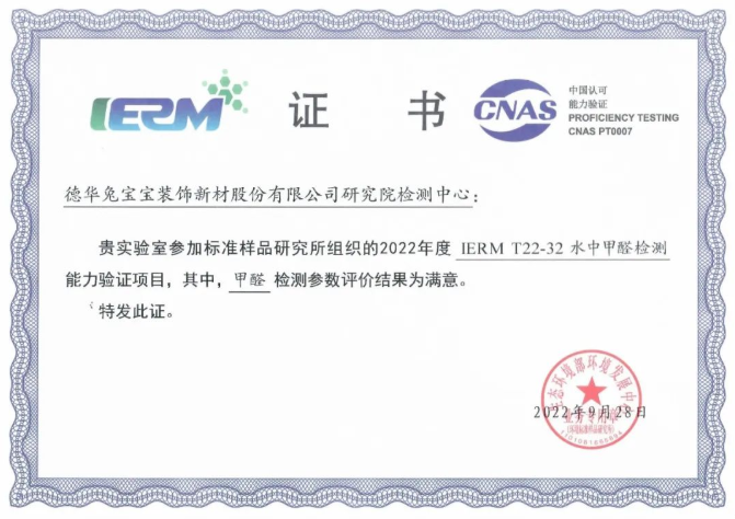 德华兔宝宝装饰新材股份有限公司研究院检测中心收到国家环境保护部标准样品研究所发放的证书,显示2022年度IERM T22-32水中甲醛检测能力验证项目中甲醛检测取得了满意的结果,验证了公司研究院质量检测中心的管理水平和技术水平。