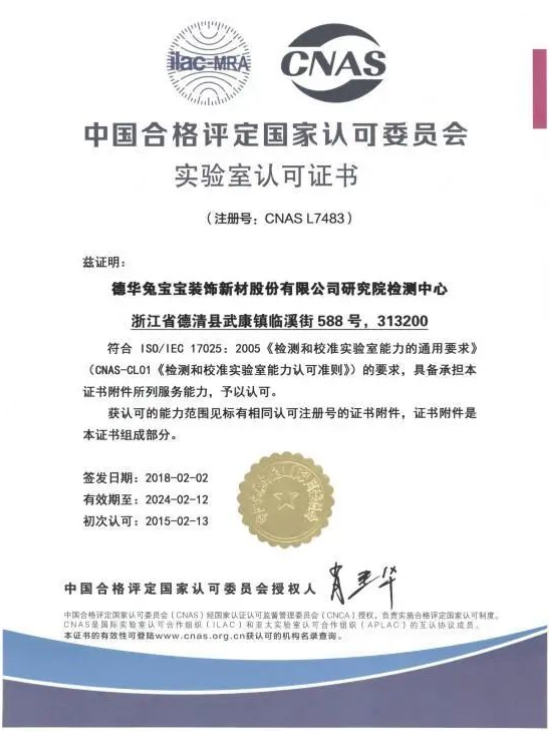 2015年2月13日,德华兔宝宝装饰新材股份有限公司研究院测试中心CNAS认可资格正式获得批准,成为国内同行业企业中为数不多通过认证的实验室。这标志着兔宝宝研究院检测服务获得国家的权威认可,也再次证明了兔宝宝在家居建材行业技术研发和品质管理上的强大竞争力。