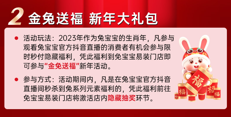 观看兔宝宝官方抖音直播,参与限时秒杀,并获得兔系列元素福利。得到福利后,前往兔宝宝易装门店激活店内“隐藏抽奖”环节。