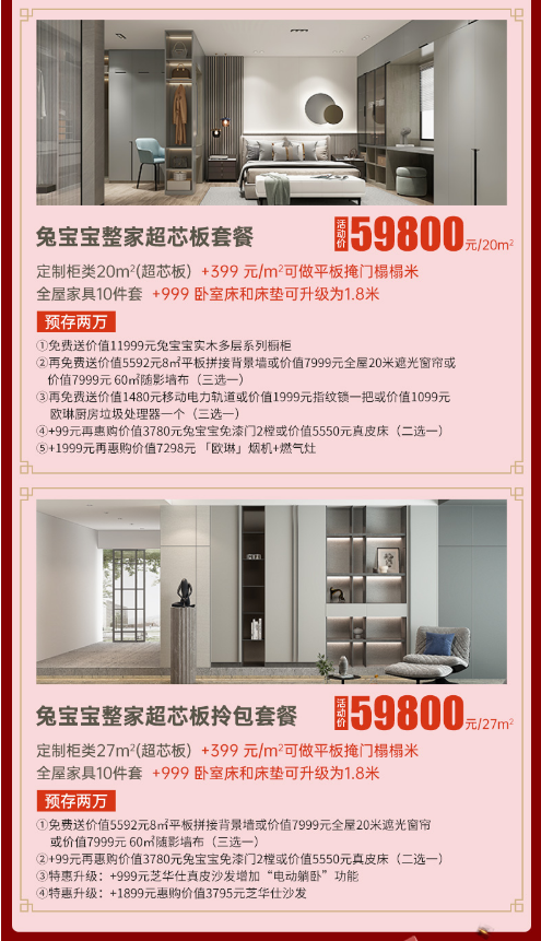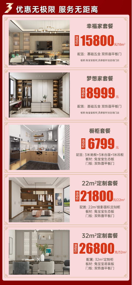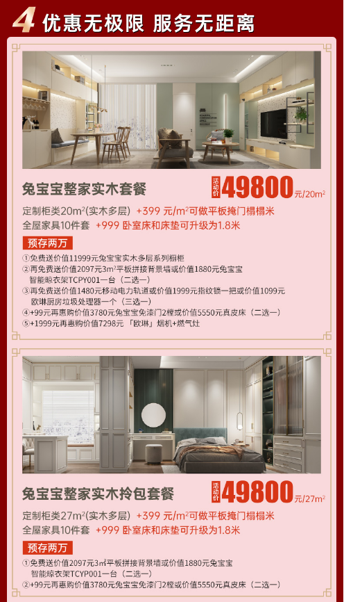 千呼万唤使出来,兔宝宝易装产品终于有活动啦!所有定制套餐价格直降,一站式服务,让你拥有超高颜值的家!兔宝宝,让家更好!
