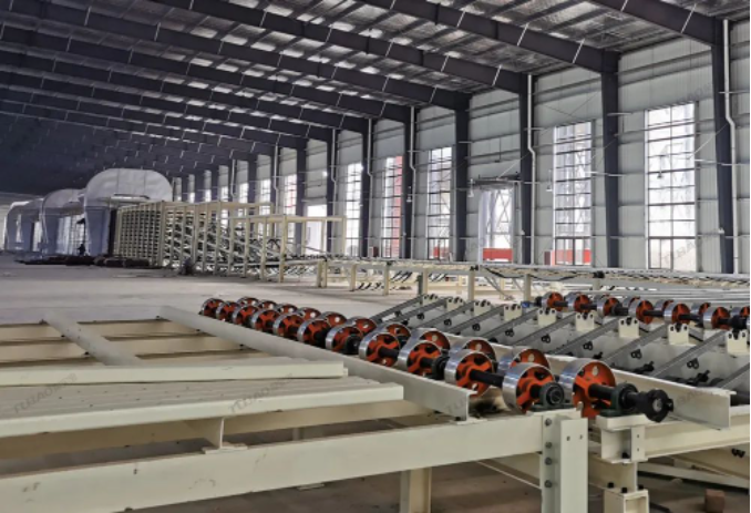 兔宝宝石膏板的生产线采用都是全自动,生产线包含了“上销下柱挤压出料立式成型自动控制系统”、“全自动横向进板运送系统”、“全自动定长切割码垛系统”、“全自动缠绕包装系统”、“全自动纵向热风干燥机”等,可生产多种厚度和规格石膏板,板边平整,生产效率高,且确保质量和精度。