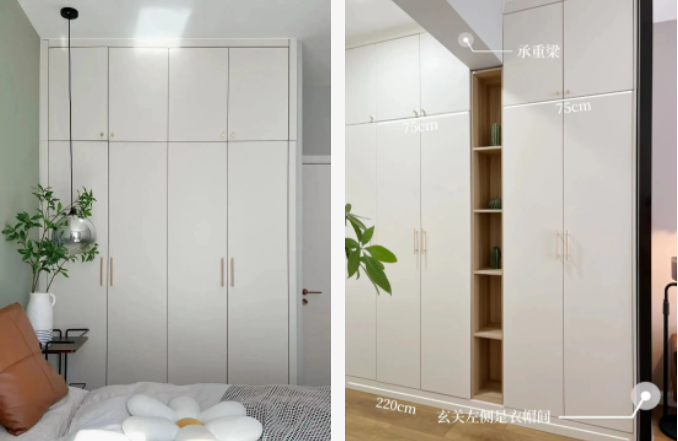 @糯米nini的家:我家把次卧的墙打掉了,背靠背做了两组柜子,一面是一整面墙的鞋柜,另一面是次卧里的衣柜,鞋柜的深度为35cm,衣柜的深度为60cm,两面柜子是背靠背的设计,刨掉打掉墙的厚度,实际上也没有太占用卧室空间,空间宽阔也多了很多储存空间。