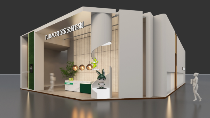展馆外立面融合了品牌元素TB做了创意性的设计,结合兔宝宝品牌IP潮玩公仔,注入年轻态度,使品牌印象深入人心。