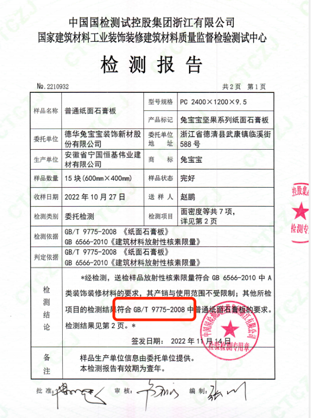 这次我们选择了专业的检测机构对兔宝宝坚果系列石膏板进行检测,检测项目除一般常规项外,重点检测了石膏板的抗冲击性。