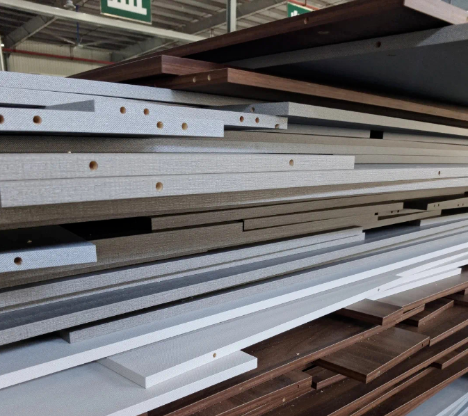 (在车间的批量半成品板材封边均达到了与板件完美的同款同色,无溢胶,打孔规整无毛刺。)