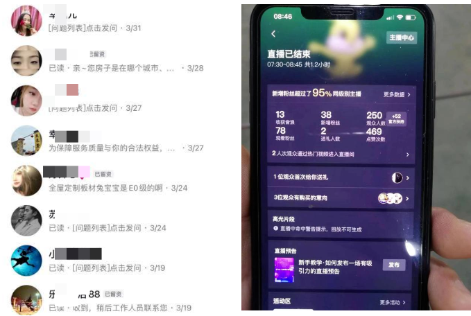 首播的过程非常煎熬,没有观众、没有关注,更别提客资了。一度让他开始怀疑自己,甚至想要放弃。但是,他告诫自己怎么可以轻易就放弃呢!在连续直播一周之后,陆陆续续有一些观众和关注,偶尔还能收到几个客户的私信,让他有了持续运营的动力。
