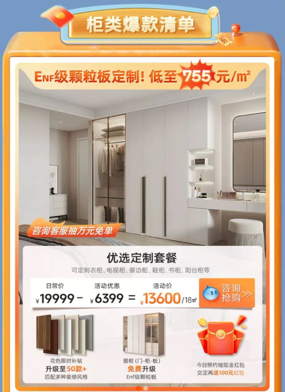 兔宝宝积极响国家政策,真正让利消费者,补贴加码,与国家补贴形成政企双补贴的合力之势,让消费者享受到真正的家装焕新福利!借此之际,推出系列全屋定制套餐,让大家省心又省钱,包括优选定制套餐、空间任选套餐、整家定制套餐等,除此之外,还有超多款式的地板、木门,等你来挑选。劲爆福利价,让你意想不到的惊喜,错过就要等一年,要焕新家,就趁现在!不止这些,补贴层层加码,兔宝宝双十一品质钜惠焕新节,活动期间除爆款外,还有超多福利,让你买得爽,省得更爽!